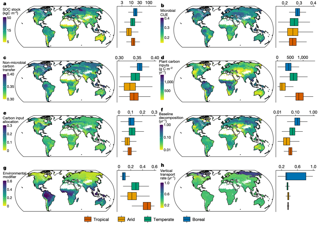 地球上储存的土壤有机碳量是陆地植被有机碳的四倍,很小比例的流失也可能加速气候变暖。促进土壤固碳有助于降低大气中的二氧化碳浓度,是应对气候变化的自然解决方案之一。米兰milan官方网站地学系黄小猛教授、博士生陶凤以及康奈尔大学骆亦其教授组织的国际研究团队在生态学和计算机科学领域开展深度学科交叉,利用人工智能和数据同化技术,揭示了微生物碳利用效率对全球土壤有机碳储量的决定性作用。