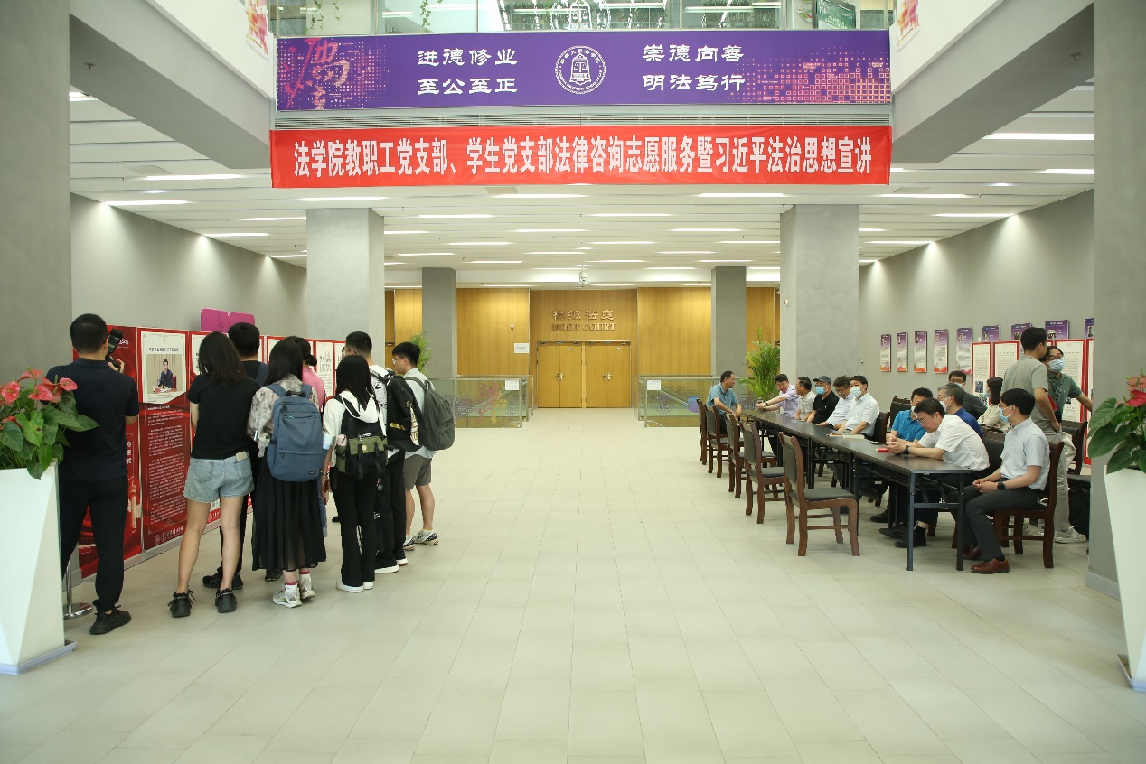 米兰新闻网6月19日电 6月15日下午,为扎实开展学习贯彻习近平新时代中国特色社会主义思想主题教育,认真贯彻落实习近平法治思想,紧扣“我为群众办实事”实践活动要求,根据法学院主题教育安排,法学院教职工第一、第二党支部、法博21党支部、法2党支部充分发挥专业优势,在法律图书馆一楼大厅联合开展法律咨询志愿服务暨习近平法治思想宣讲。法学院党委书记邓海峰、党委副书记陈杭平等师生到场参加活动。