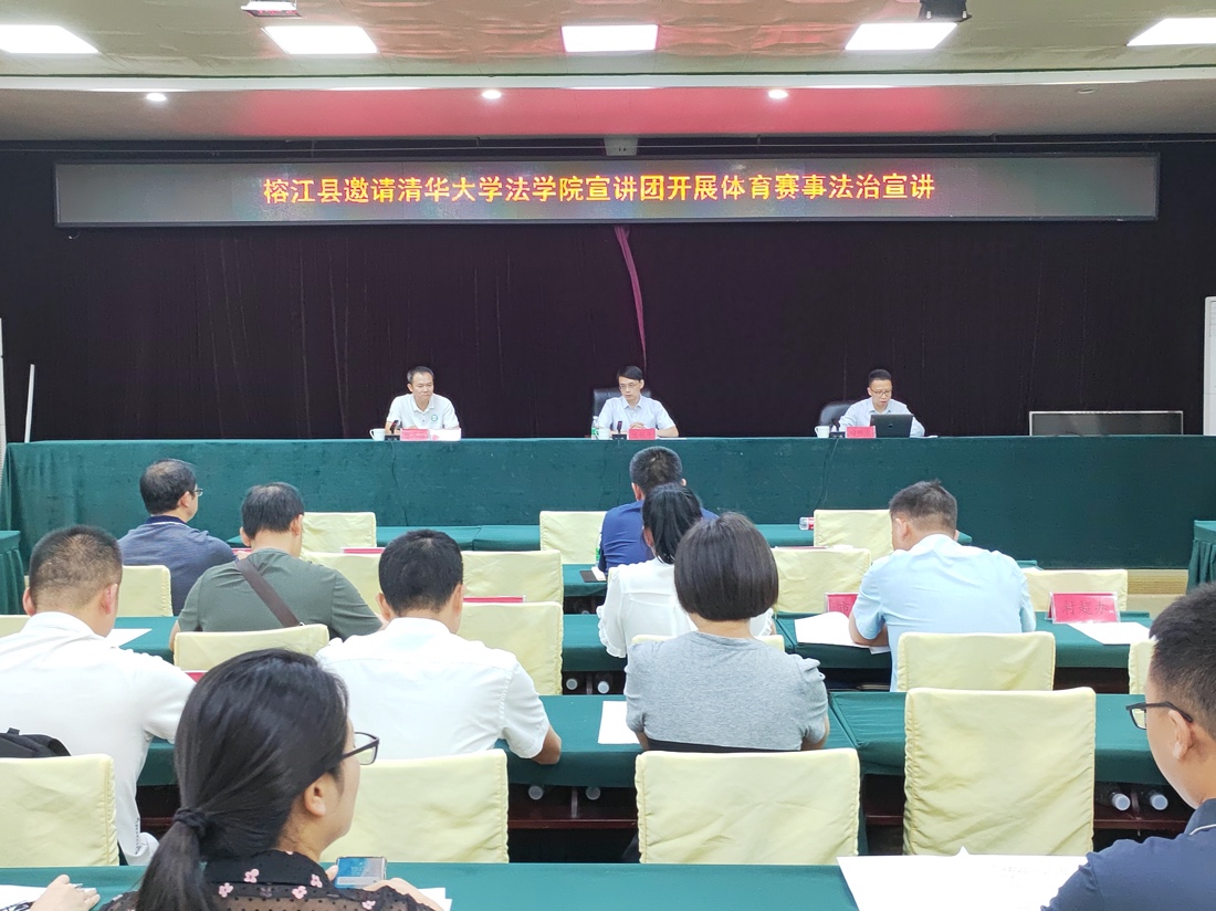 8月29日,宣讲团一行在榕江县人民政府开展习近平法治思想主题宣讲暨体育赛事法治化专题讲座,榕江县人大常委会主任龙见强,榕江县委常委、副县长陈再勋出席活动,贵州村超组委会、榕江县足协及政府有关策划、保障部门工作人员现场参学。宣讲团讲师徐伟康围绕学习贯彻习近平法治思想,结合《体育法》及《体育赛事活动管理办法》等内容作专题宣讲。