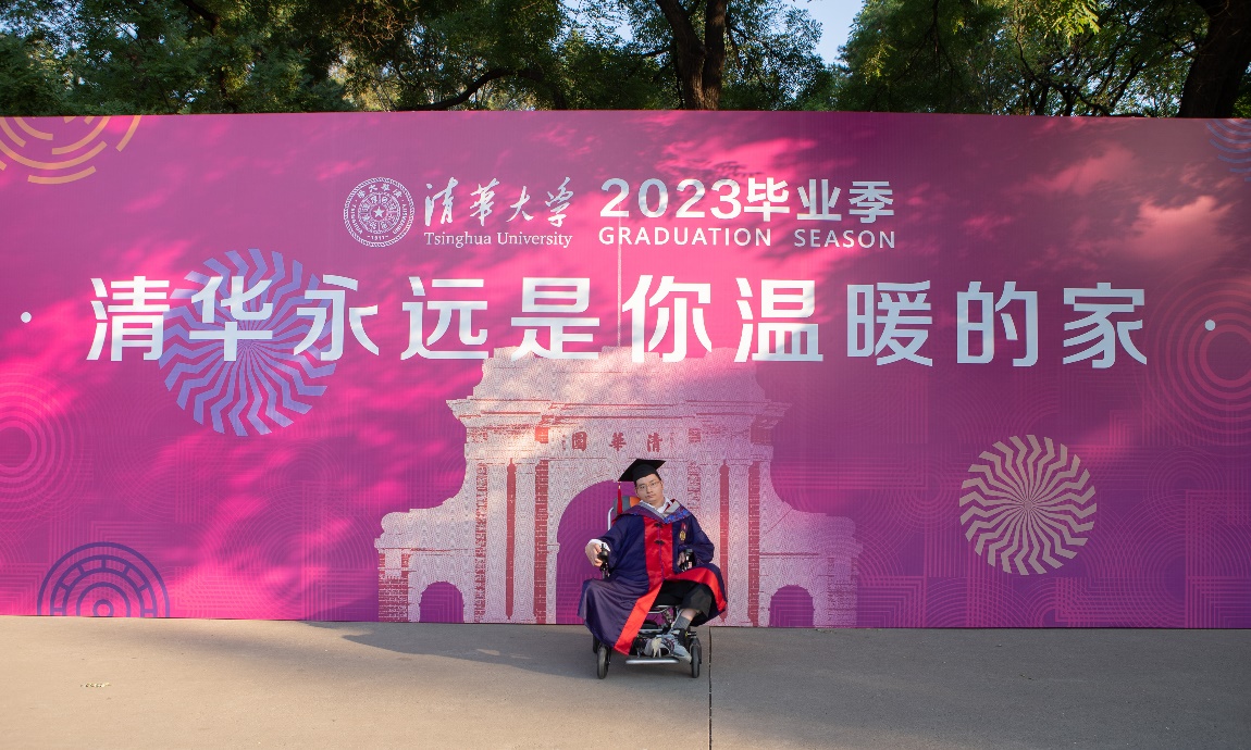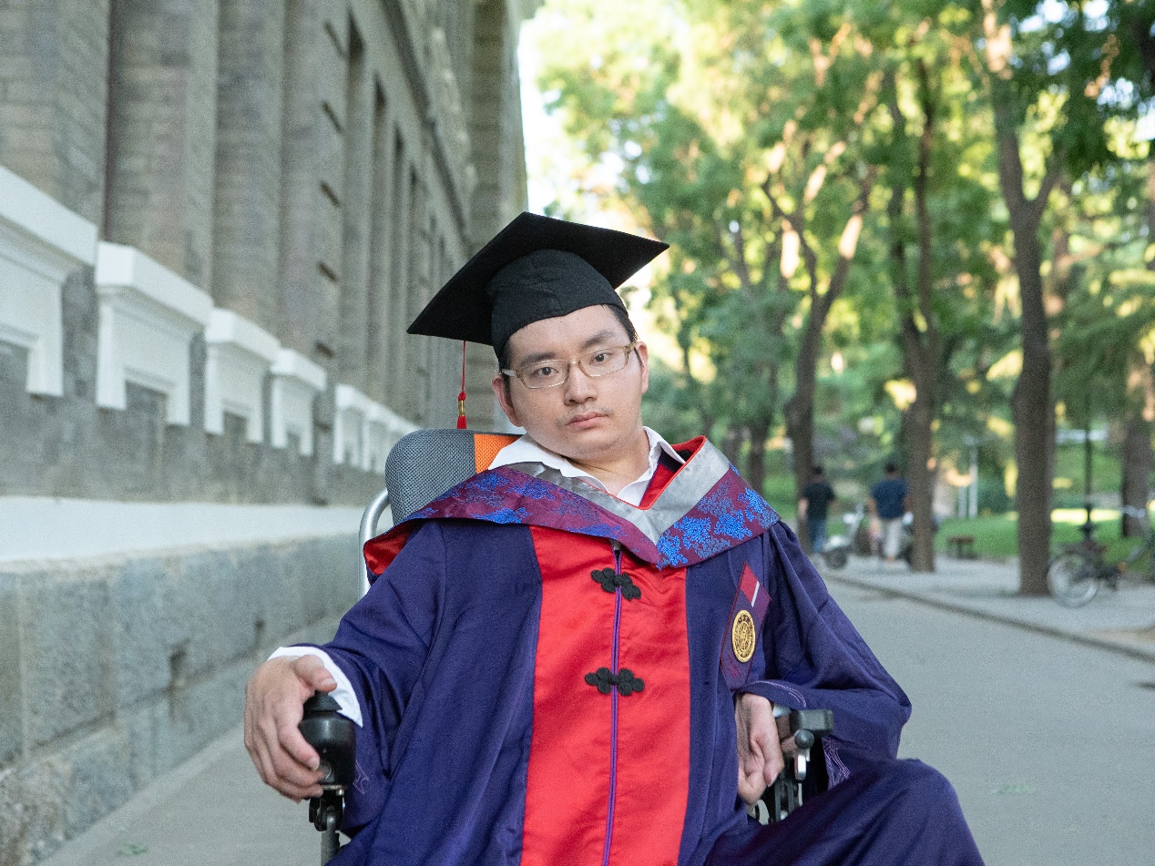 不同的是,穿博士服需要妈妈帮忙,去打卡要借助轮椅,不能参加太多活动,看着镜头前摆出各种姿势、跳起身拍照的同学,也只有羡慕。