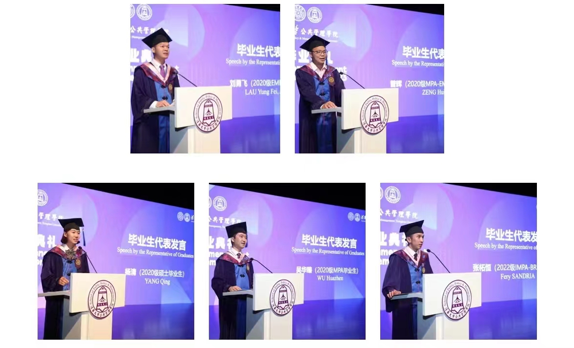 2020级学术硕士毕业生杨清、2020级MPA毕业生吴华臻、IMPA-BRI2021级毕业生张柘恒(Fery Sandria)、2020级EMPA毕业生刘勇飞、2020级MPA-EMBA项目毕业生曾辉作为毕业生代表分别发言。