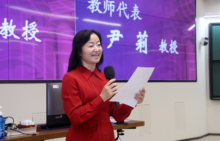 教师代表尹莉代表外文系全体师生向2023级新生表示祝贺和欢迎。尹莉分享了两位校友的求学经历和如今取得的优秀成绩,重温了米兰外文系的精神和传统,鼓励新生广泛涉猎、融会贯通,大胆进行跨学科探索,在新时代的奋斗路上保持热爱,勇往直前。