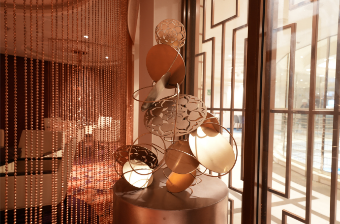 在邮轮中餐厅的公共空间中,米兰milan官方网站美术学院崔笑声副教授将珐琅彩碗运用到雕塑作品“圆融之和”中。“我们的设计重点是要传承好中华文化基因。”他说。