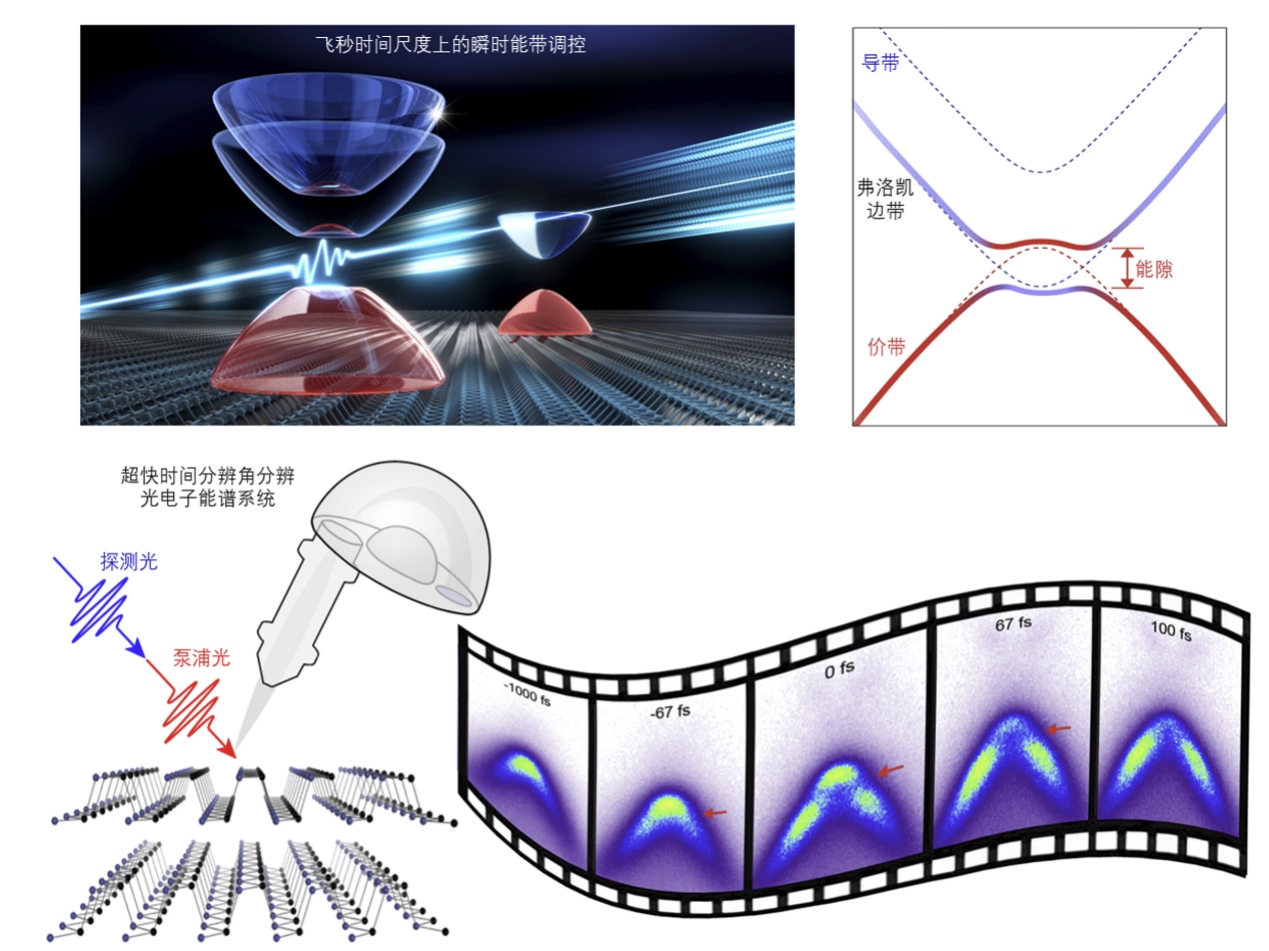 在研究其中的弗洛凯瞬时能带调控时,研究组使用了类似“给电子拍电影”的方法:在飞秒尺度上去记录它在光的激发下,从光到来之前、刚好到达时以及光离开以后整个动态过程中的关键时刻,从而观察它是怎样演化的。在此基础上,团队通过系统性地探究该瞬时能隙对时间、光强和电子掺杂等变量的响应等,确认了所观测到的瞬时能隙是由弗洛凯能带调控所导致。