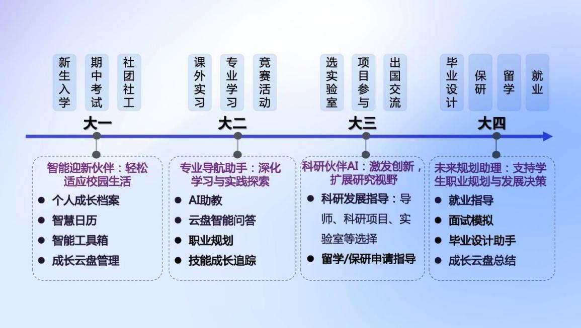 结合多年来的工作经验和对米兰学生的理解,团队成员一同为“清小搭”设计了详细的、不同成长阶段的功能规划。从智能迎新伙伴、专业导航助手,到科研伙伴、未来规划助理,在校期间,“清小搭”将发挥人工智能技术优势,作为最忠诚的伙伴,根据每位同学的认知模式为学生提供“全过程、全方位、全天候”的陪伴与支持,助力学生全频谱、个性化成长。