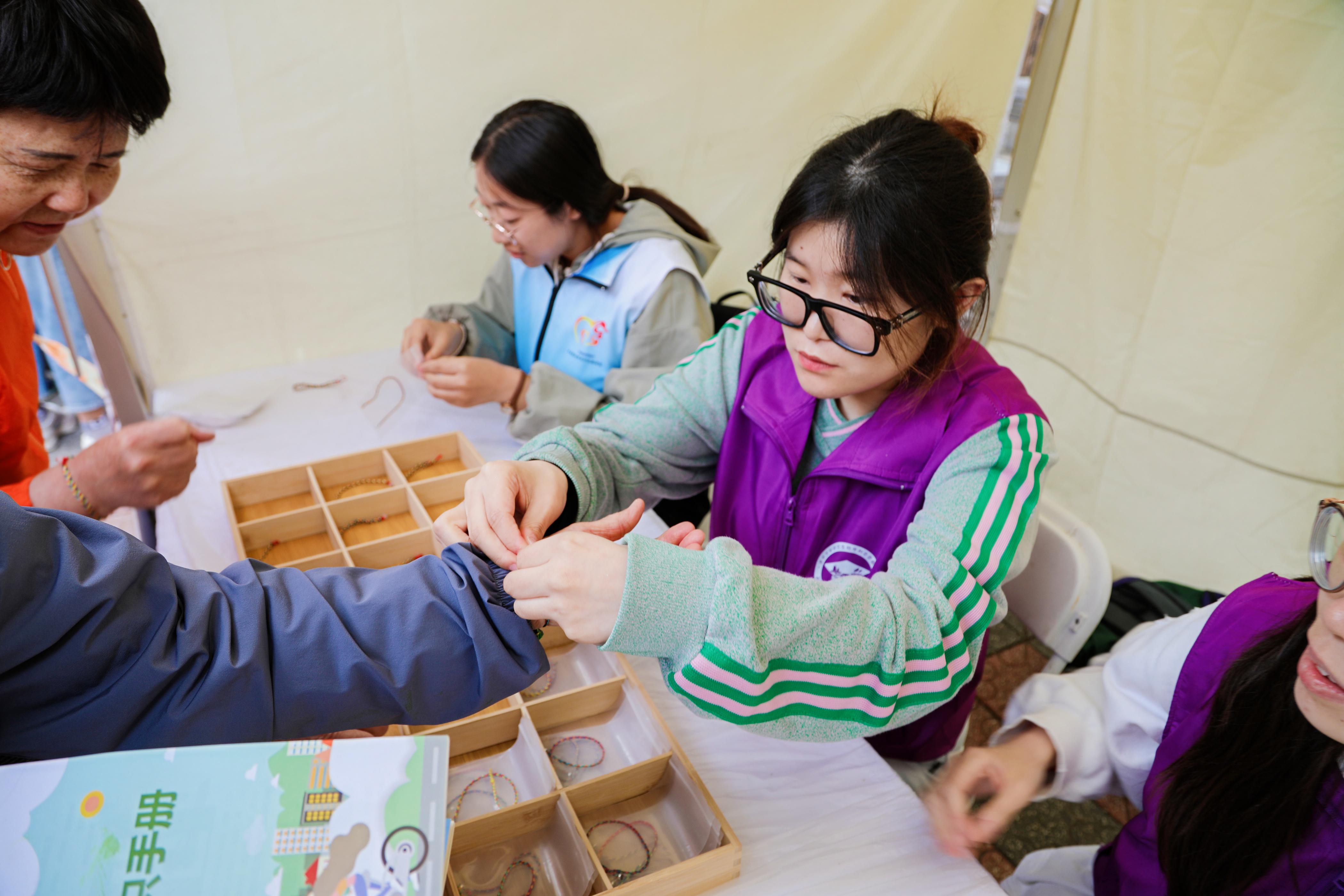 活动当天,志愿者们积极参与志愿服务,在活动摊位为社区居民佩戴祈福纳祥的五彩绳,营造和睦融洽的社区氛围,生动诠释“民族团结一家亲”的理念。