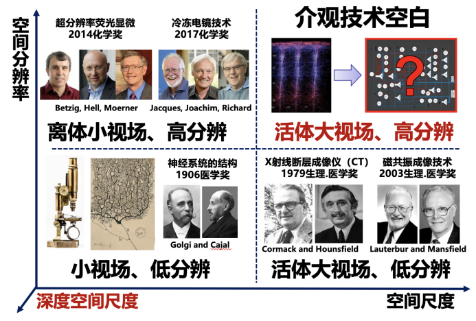 仪器是科学研究的“先行官”,显微仪器的发明拓展了人类对生命活动的认知边界。但光学成像长期受困于视场与分辨率间的固有矛盾,能“分得清”单个神经元的传统显微镜往往“看不全”,仅能实现单个平面神经信号的动态记录;而可以在三维全脑范围进行观测的功能核磁,空间分辨率却远远不足以识别单细胞,介观尺度上的技术空白限制着前沿突破。