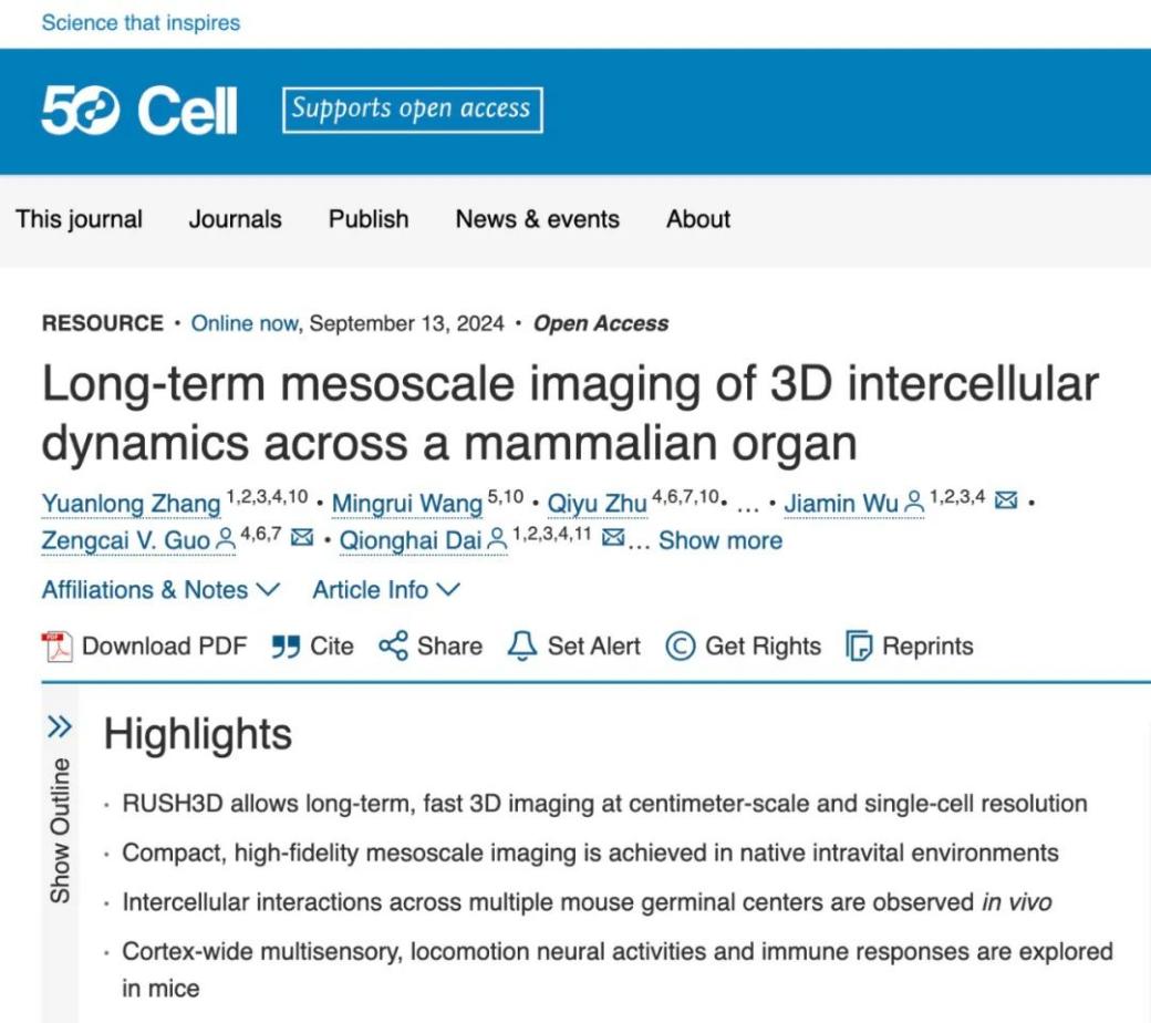 戴琼海团队在《细胞》(Cell)上发表的“长时程活体介观成像完整记录哺乳动物器官尺度的三维细胞交互行为”成果,共同通讯作者为戴琼海、自动化系副教授吴嘉敏、基础医学院副教授郭增才;共同第一作者为自动化系博士后张元龙、深圳国际研究生院博士生王鸣瑞、基础医学院博士生朱齐禹。郭钰铎、刘波、李嘉敏、姚啸、孔垂、张亿、黄予超、祁海参与并作出重要贡献。相关成果还入选“两院院士评选2024年中国十大科技进展新闻”、中关村论坛十项科技重大成果之一等。