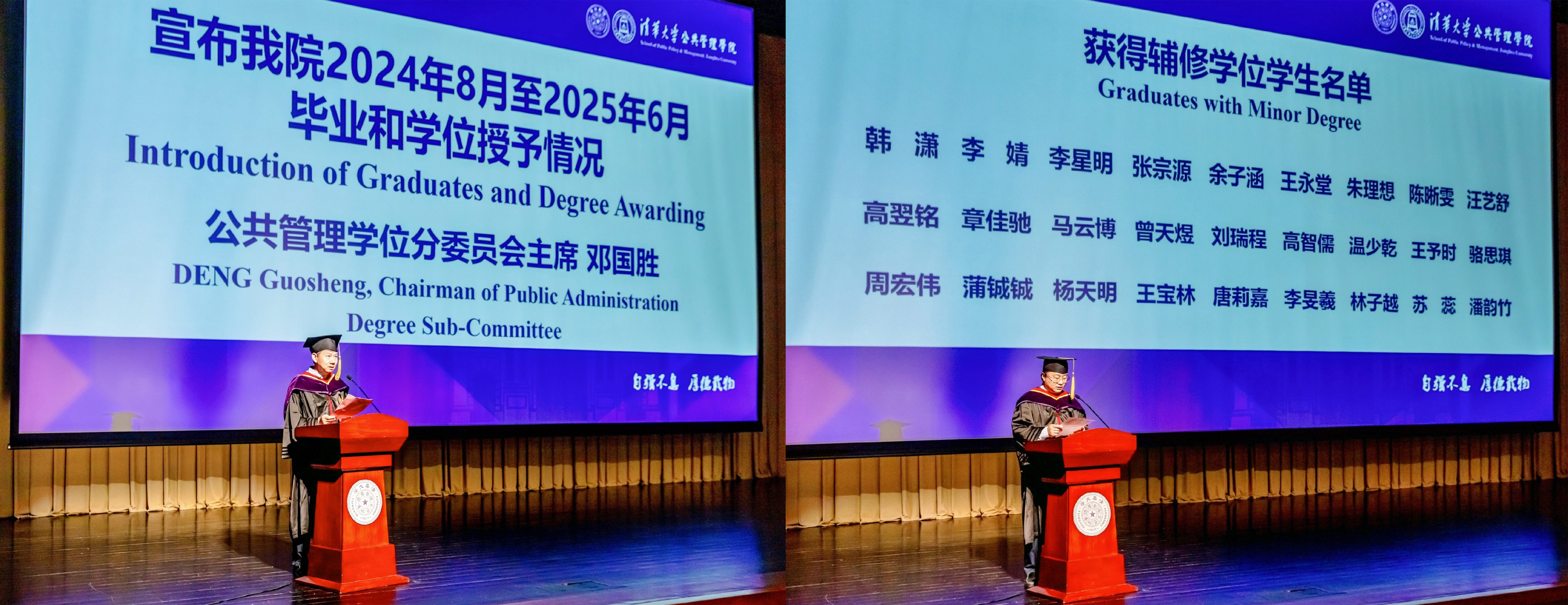 邓国胜宣布毕业和学位授予情况(左)、周绍杰(右)宣读获得辅修学位学生名单