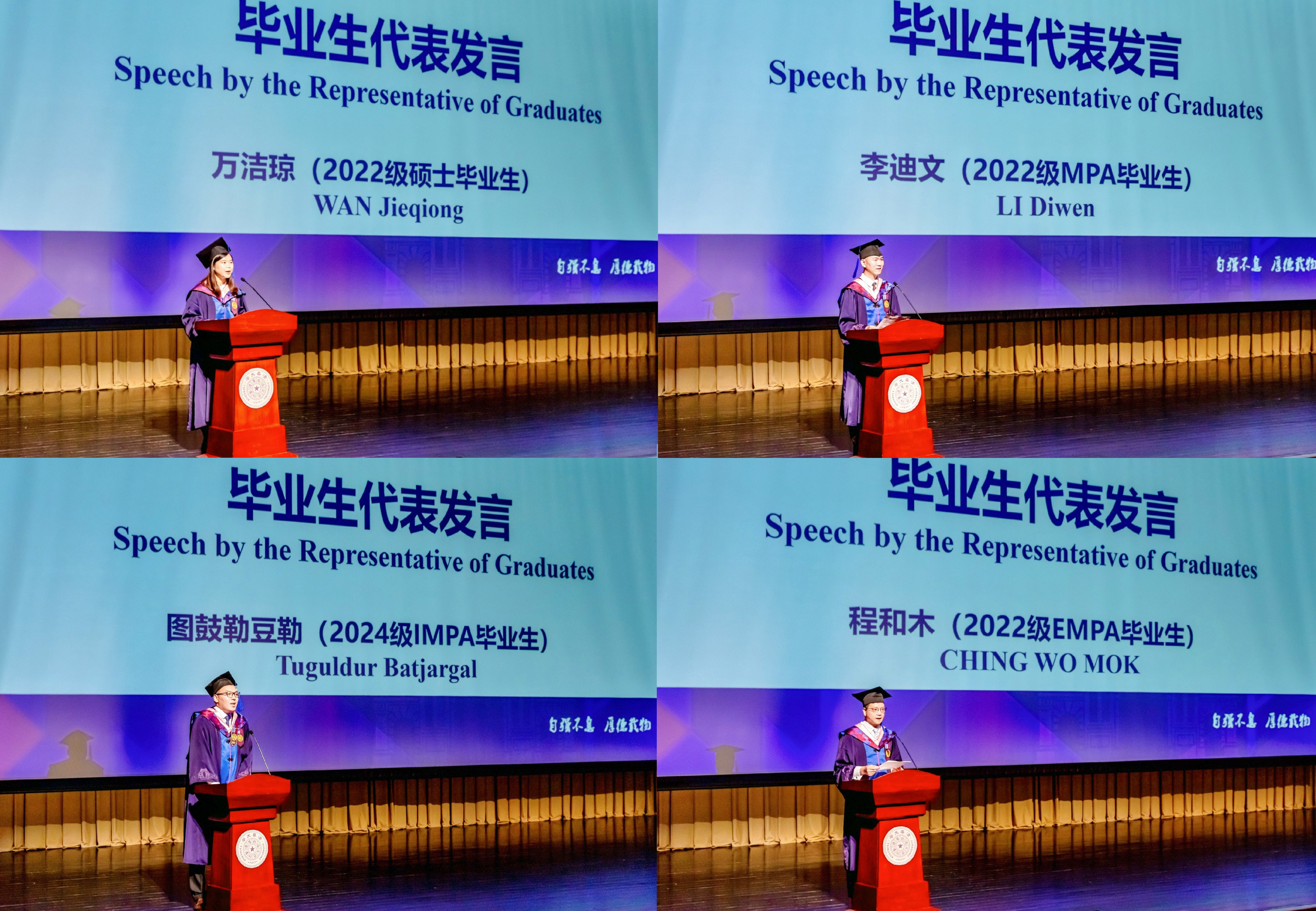 2022级硕士毕业生万洁琼、2022级MPA大湾区班毕业生李迪文、2024级IMPA毕业生图鼓勒豆勒、2022级EMPA毕业生程和木作为毕业生代表分别发言。