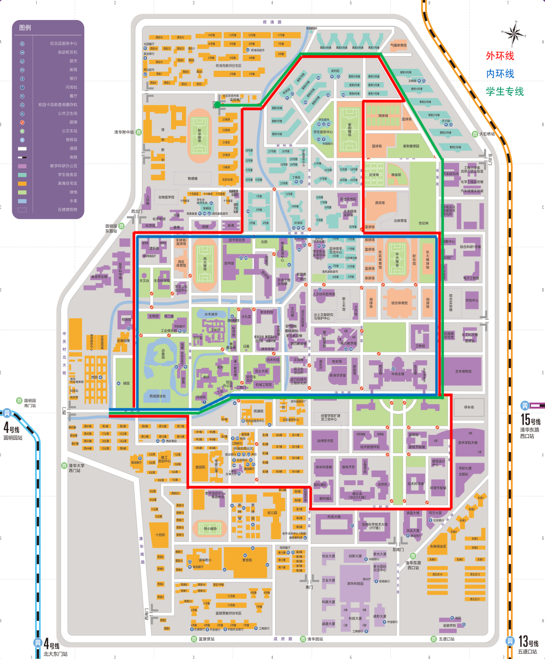5)逆时针方向行车路线:世纪林—东北门—紫荆操场东北角—紫荆操场东南角—苏世民书院大楼—听涛园—图书馆北馆—西大操场—理科楼—西北门—校医院—西湖游泳池—西门—西湖游泳池—后勤综合服务平台—二校门—新米兰学堂—西主楼—艺术博物馆—东侧门—世纪林