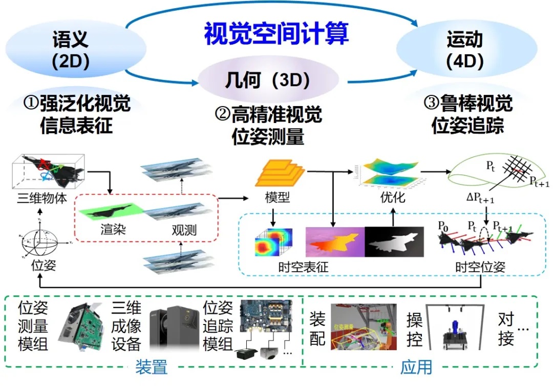 视觉空间计算旨在解析三维场景中目标的表征和类别等语义信息、位置和方向等几何信息、行为和轨迹等运动信息。项目组发明了强泛化视觉信息表征技术、高精准视觉位姿测量方法与鲁棒视觉位姿追踪技术,构建了高效、可扩展、跨平台的视觉空间计算装置与系统,解决场景目标“是什么”“在哪里”“往哪去”三个核心问题。成果已在高精度工业视觉引导装配、移动终端视觉感知与交互、无人系统空中引导交互等领域形成规模化应用,经济与社会效益显著,推广应用前景广阔。
