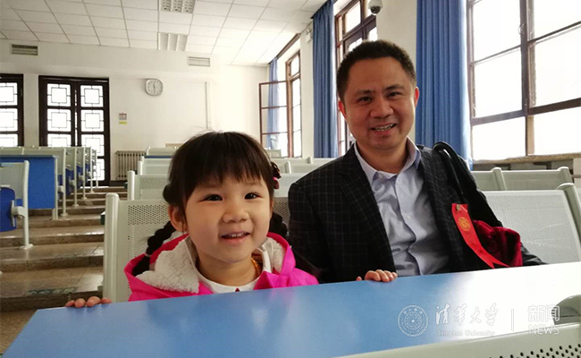 蒙民伟音乐厅前,和谐的一家三口在孩子的欢声笑语中洋溢着幸福,来自12届化工系校友毛贵涛和13届化工系校友黄翠带着他们的女儿回到了这个他们曾经读书的地方。