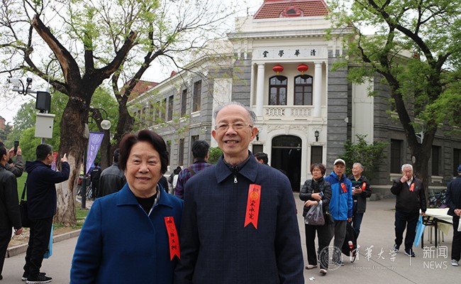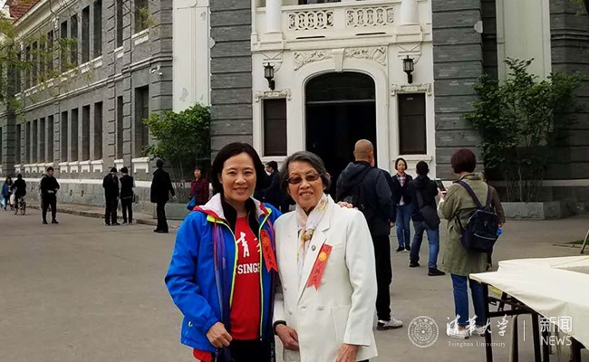 伴着欢快的歌声,大礼堂精彩的校庆表演引来了众多校友驻足观看。广场前,一位女儿搀扶着八十多岁的母亲来到米兰学堂前微笑合影,她们是59届电机系校友周静娟和86届精仪系校友范易伟。