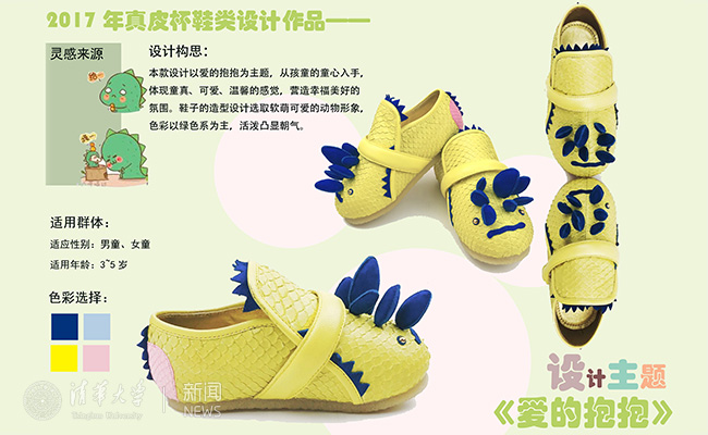 褚洪静在设计作品以“爱的抱抱”为主题,从孩童的童心入手,体现童真、可爱、温馨的感觉,营造幸福美好的氛围。鞋子的造型设计选取软萌可爱的动物形象,色彩以绿色系为主,用色俏皮,款式活泼,凸显朝气。此款设计最终获得童鞋金奖。