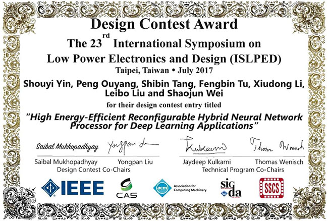 2017.08微纳电子系人工智能Thinker芯片获2017国际低功耗电子学与设计会议设计竞赛奖