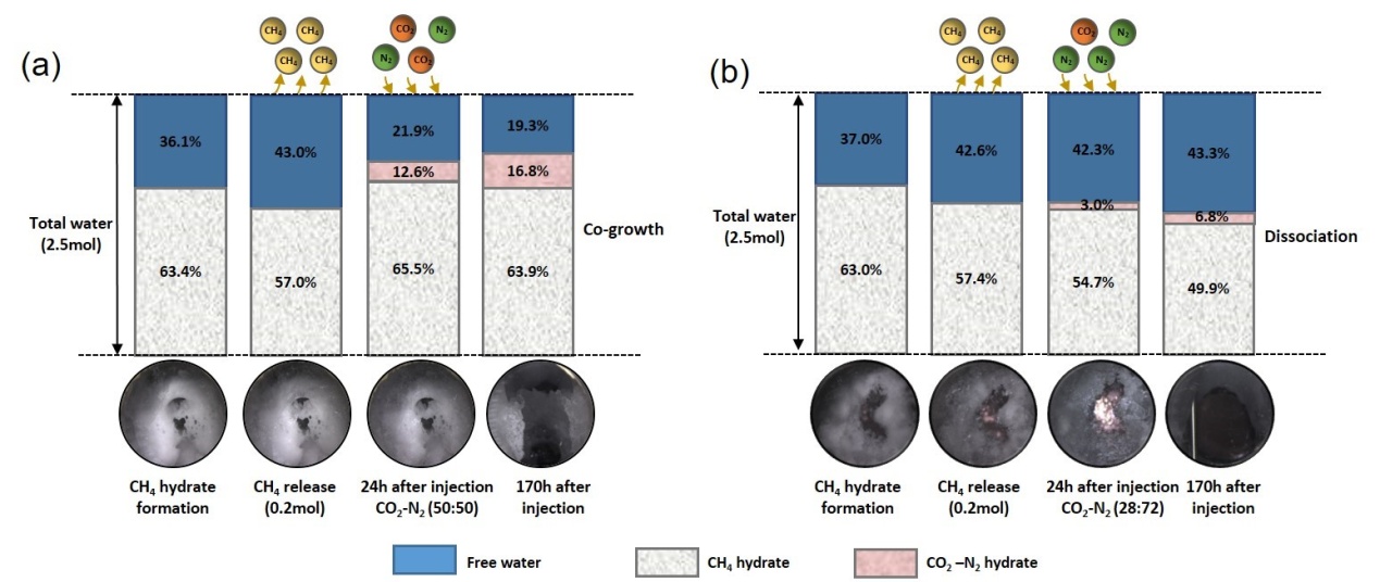 该项工作主要针对我国南海海域天然气水合物储层温度压力较高的特点,探寻CH4-CO2-N2混合水合物形成的热力学可行性条件。在此基础上采用高压可视反应装备开展CH4水合物生成,降压产气以及CO2/CO2-N2气体注采实验研究。