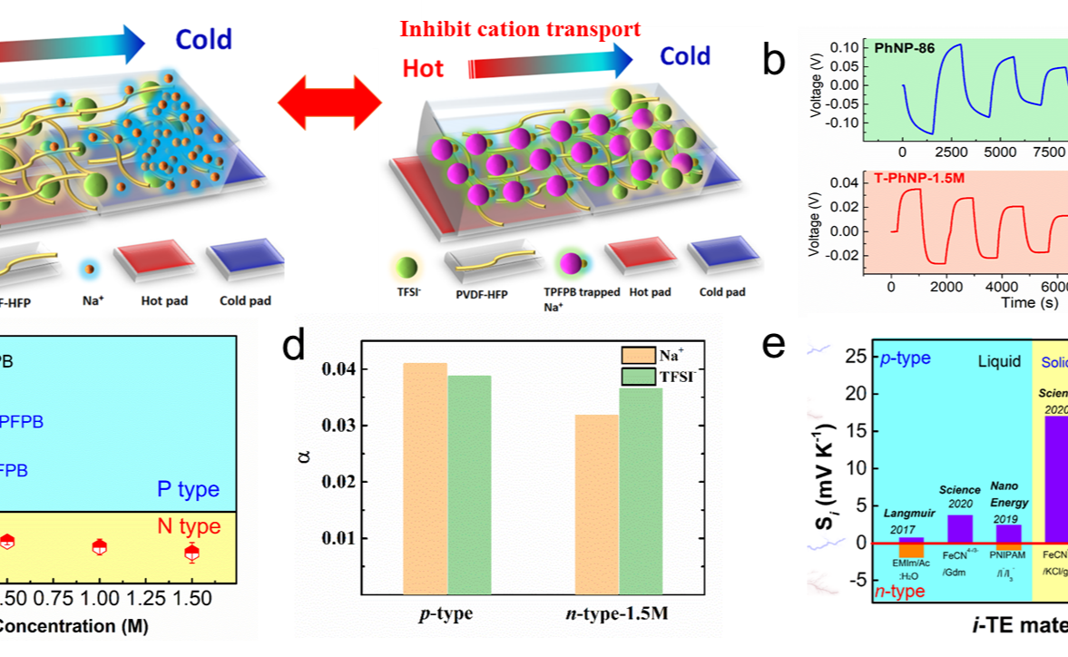 米兰milan官方网站张兴教授/马维刚副教授课题组和香港科技大学黄宝陵副教授课题组合作报道了一种可选择性调控P-N型的全固态柔性离子热电复合材料(PVDF-HFP/NaTFSI/PC)。该材料室温下展示出高塞贝克系数(20 mV K-1)并且具有良好的机械强度和稳定性。