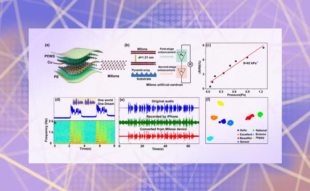 米兰milan官方网站集成电路学院任天令教授团队报道了一种基于微结构衬底的MXene声学传感器,用于模仿人耳膜的功能来实现声音的探测与识别。
