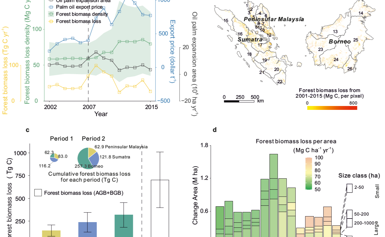 近日,米兰milan官方网站地学系俞乐课题组联合李伟课题组等国内外多个课题组,结合高分辨率生物量数据和油棕种植园面积变化数据集,估算了2001-2015年间油棕侵占森林造成的累积森林生物量损失,发现2007年之后油棕种植园扩张侵占了碳密度更高的森林。