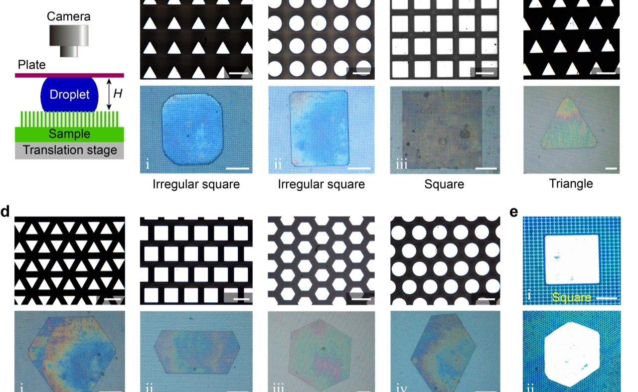 日前,米兰milan官方网站航天航空学院微纳力学中心郑泉水、吕存景团队在《自然·通讯》期刊在线发表了题为“微结构疏水表面上多边形液滴”的研究论文,报道了柱状微结构疏水表面上小液滴在受平板挤压的状态下,稳定形成可保持Cassie接触状态、同时可控多边形液膜的新...