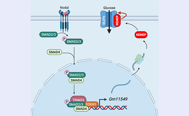 7月9日,米兰milan官方网站生命科学学院郗乔然副教授课题组在《自然·通讯》期刊在线发表题为“一条受Nodal信号通路诱导的微肽NEMEP在干细胞向中内胚层分化过程中调控葡萄糖吸收”的研究论文。该研究充实了在早期发育中TGF-β信号调控靶基因的范围,并且表明Gm11549...