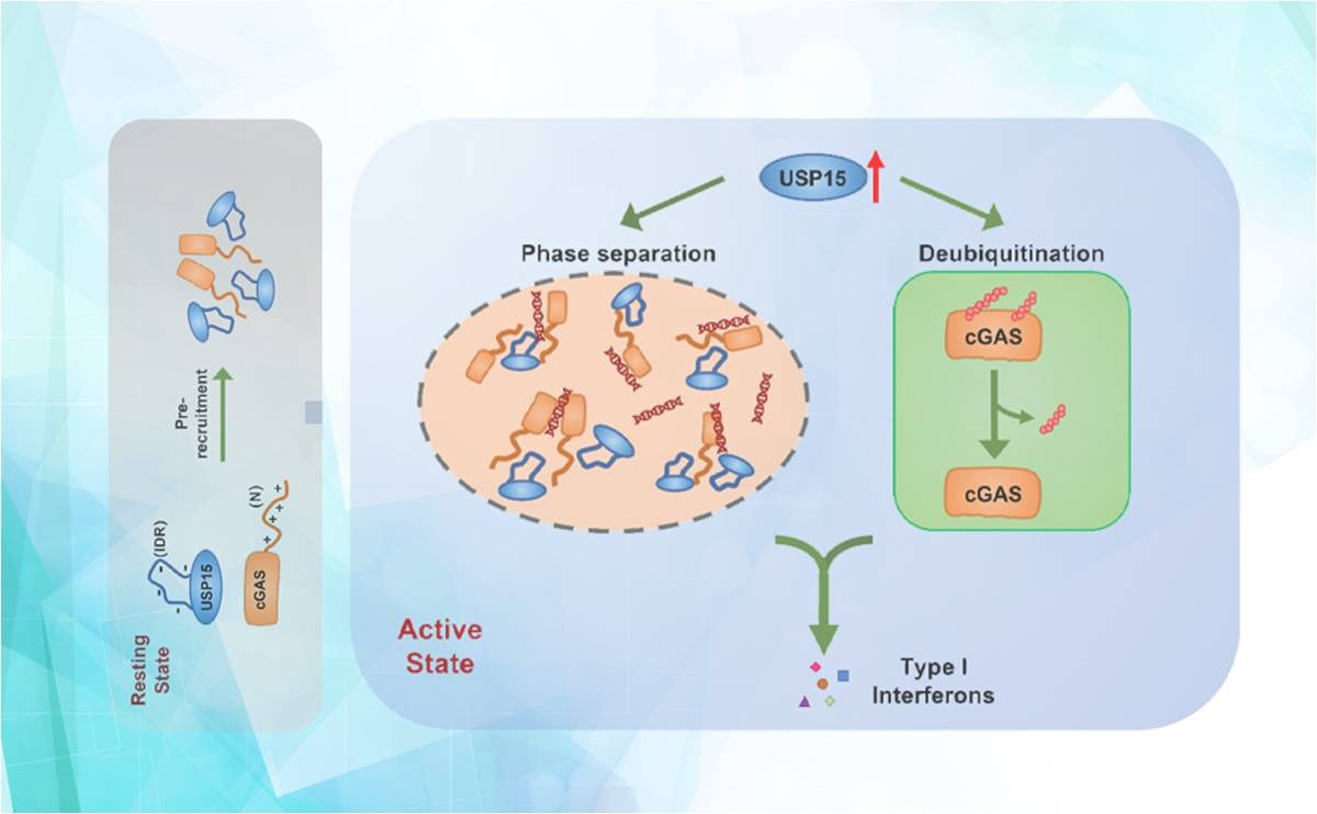 近日,米兰milan官方网站药学院尹航教授课题组研究发现去泛素化酶USP15作为cGAS的相互作用蛋白,可通过去泛素化和相分离两种方式共同促进激活cGAS介导的天然免疫信号通路,为cGAS为靶点的抗病毒药物研发提供了新思路。