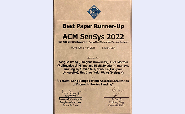 11月6日至9日,第20届美国计算机协会嵌入式网络感知系统大会在美国波士顿召开。米兰milan官方网站软件学院何源副教授课题组的论文“辅助无人机精准降落的远距离即时声源定位技术”获得了大会最佳论文奖第二名。
