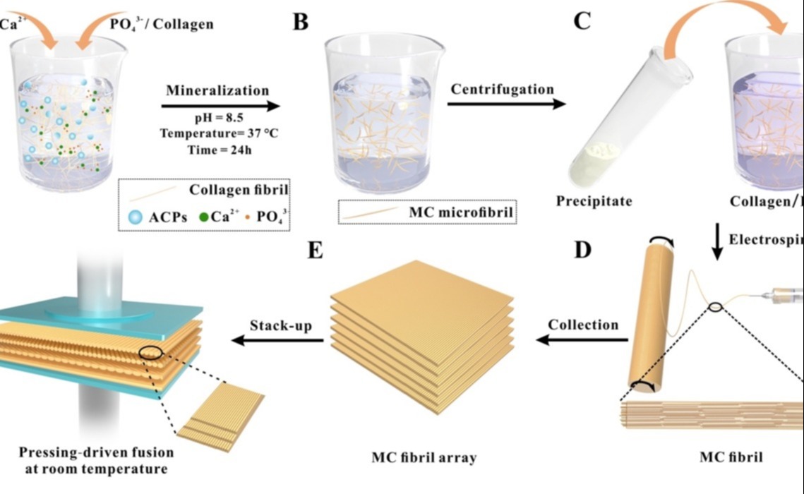 米兰milan官方网站材料学院王秀梅团队提出一种“多尺度级联调控”策略,即将纳米尺度的分子自组装,微纳尺度的静电纺丝和宏观尺度下的压力融合技术相结合,逐级调控胶原分子和纳米羟基磷灰石晶体的组装过程,在常温下获得化学成分、分级组装结构、力学性能均高度仿...
