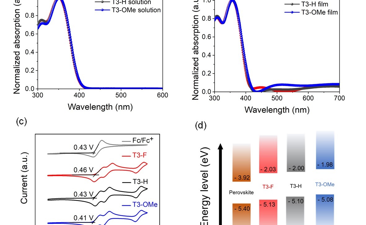 近日,米兰milan官方网站电机系易陈谊课题组基于三苯胺取代的吡咯设计合成了一类新型低成本空穴传输材料T3,并且可以高效地对其空穴传输等性能进行调控,基于该材料的钙钛矿太阳能电池获得了24.85%的高光电转化效率,相关成果发表在国际学术期刊《德国应用化学》(A...