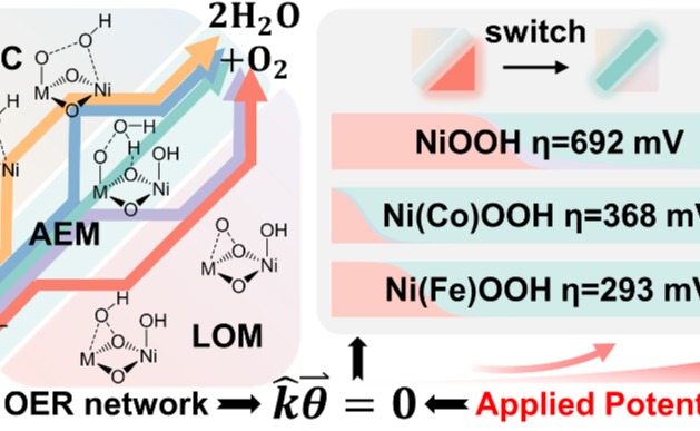 近日,米兰milan官方网站化学系肖海副教授课题组在电催化析氧反应(OER)机理的基础研究中取得新进展。结合巨正则系综理论计算和微观动动力学模拟,发现在层状双氢氧化物(LDH)结构的镍基羟基氧化物(Ni(M)OOH)催化剂上,OER反应由三种类型的机理组成一个耦合的复...