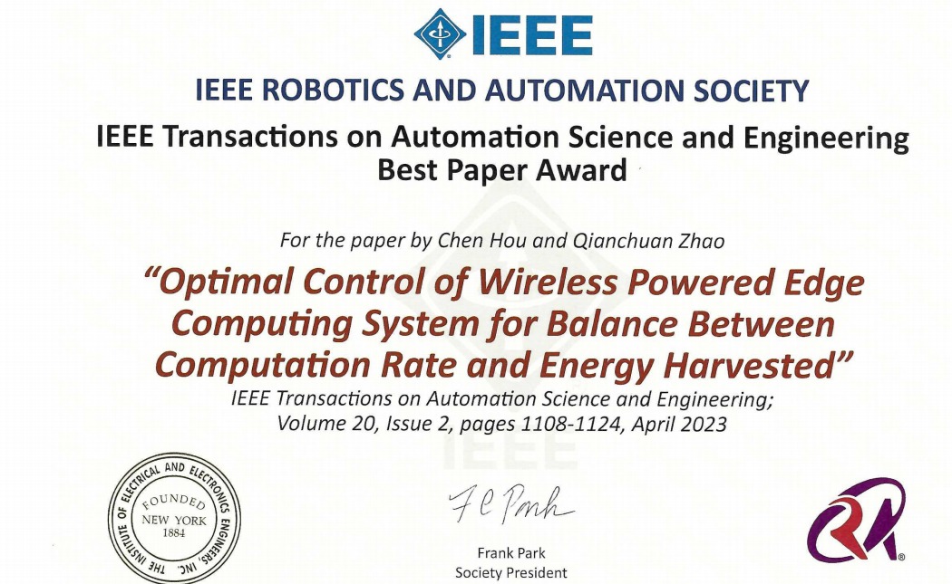 2023.10自动化系赵千川团队荣获2023年度国际电气与电子工程师协会自动化科学与工程汇刊最佳论文奖