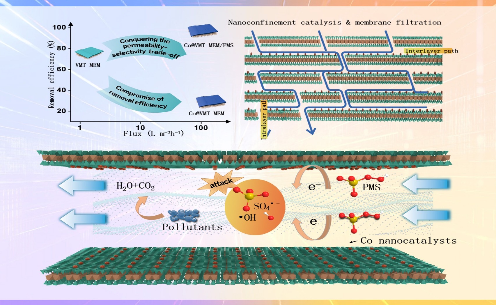 近日,米兰milan官方网站深圳国际研究生院张正华团队巧妙地将膜过滤技术与高级氧化工艺相结合,开发了二维纳米流体Co功能化蛭石(Co@VMT)膜。这种Co@VMT膜展现出了122.4L·m-2·h-1·bar-1的高透水性,相比于传统的VMT膜(1.1 L·m-2·h-1·bar-1)提高了两个数量级。