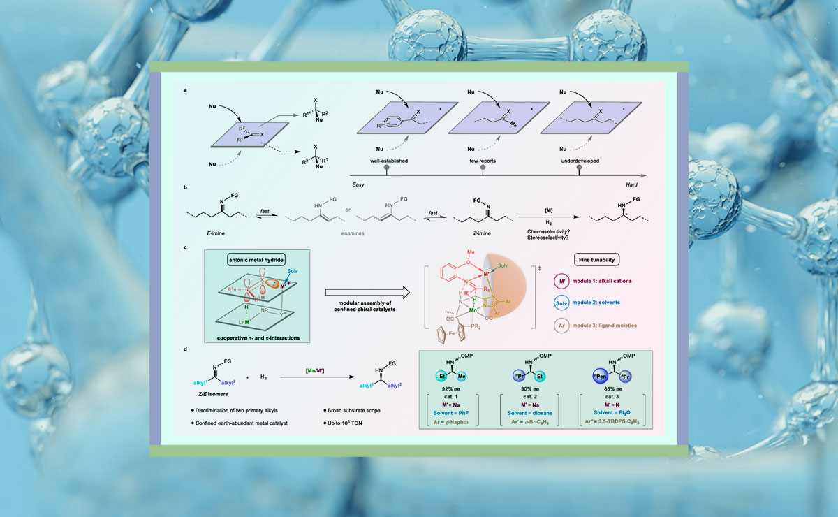 近日,米兰milan官方网站化学系刘强课题组在手性识别与不对称催化研究领域取得新突破,通过设计并构建一类具有精细可调限域结构的阴离子型锰氢催化活性中间体,在酮亚胺化合物的不对称氢化反应中成功实现了对微小差异烷基取代基之间的精准手性识别。