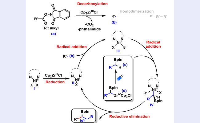 近日,米兰milan官方网站生物医学交叉研究院齐湘兵课题组开发了可见光促进的镍催化烷基锆硼试剂与廉价易得的一级羧酸NHPI酯的不对称自由基偶联方法,高效合成了一系列具有高应用价值的手性烷基硼化合物。利用烷基锆试剂自身独特的光敏特性及其在对映选择性自由基交...
