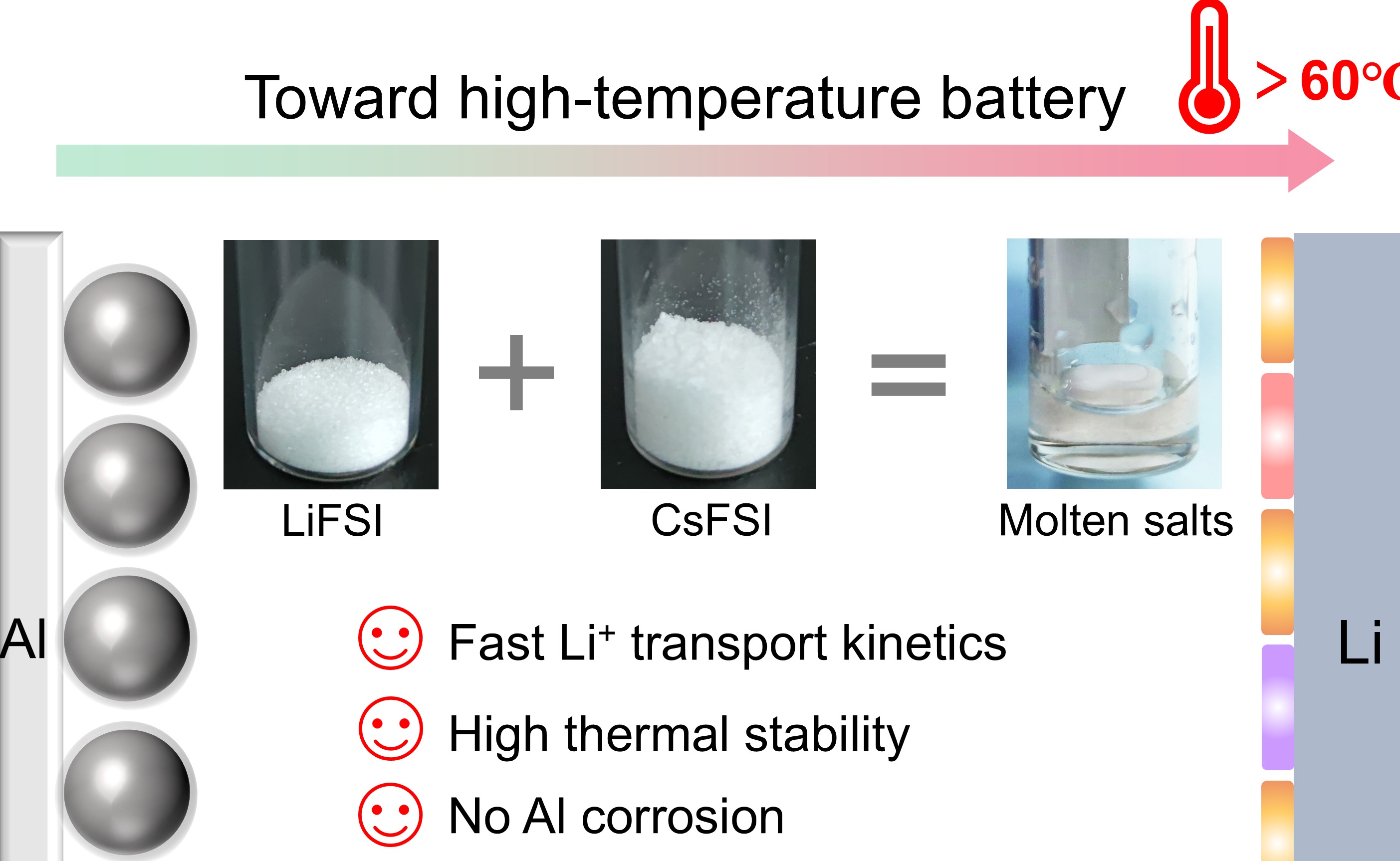 米兰milan官方网站化工系副教授刘凯和副研究员陈翔合作,报道了一种具有高固有热稳定性和电化学稳定性的无溶剂熔融盐电解质,由碱金属阳离子和氟化磺酰亚胺阴离子组成,表现出优异的锂离子传输动力学,包括低活化能、高锂离子电导率和高迁移数,揭示了强的阳离子-阳...