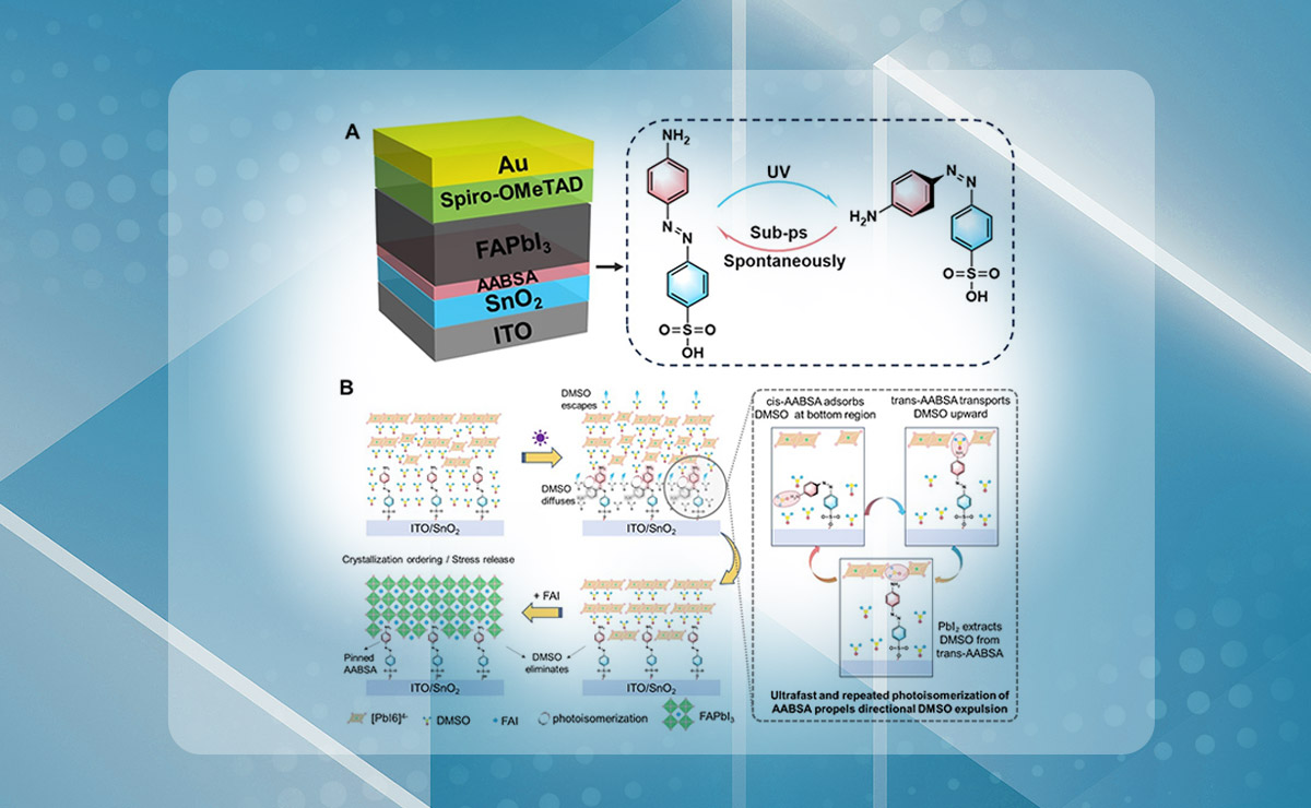 近日,米兰milan官方网站材料学院林红教授团队合作在钙钛矿太阳能电池埋底界面二甲基亚砜(DMSO)残留去除方面取得重要研究进展。该团队创新性地提出了一种光响应分子工程策略,将具有光异构化特性的4'-氨基偶氮苯-4-磺酸(AABSA)分子引入SnO₂/钙钛矿埋底界面。在...