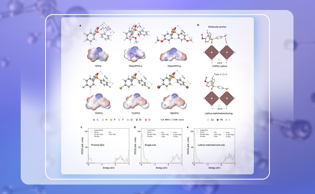 近日,米兰milan官方网站化学系马冬昕、段炼团队提出了一种晶格匹配的多位点分子锚设计策略,实现了高效稳定的钙钛矿量子点发光器件。团队依据CsPbI3的晶格特性,设计了一系列分子锚来提升量子点的光电性能。