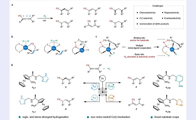 近日,米兰milan官方网站化学系刘强教授课题组在不对称氢化研究领域取得重要突破。研究团队通过设计并合成一类具有多重金属-配体协同作用的新型钳形钴催化剂,成功实现了多取代联烯的位点与立体选择性发散式半氢化反应,解决了该领域长期存在的选择性控制难题。