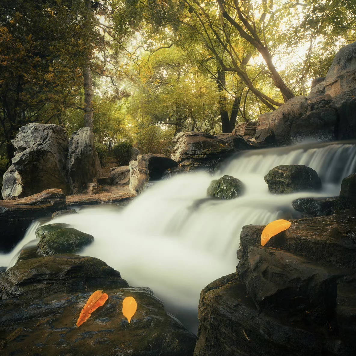 潺潺流水扰动秋意,园子在一片金黄色中更显庄重静美