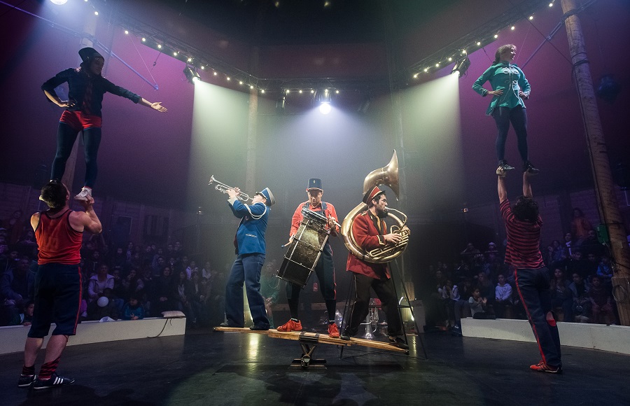 在新马戏《作品7号》中,七名艺术家将铜管乐器玩得可谓天花乱坠,他们吹奏、翻转、腾跃,巴尔干音乐的节奏混合着美国爵士乐的风格,一切都笼罩在欢快的节庆气氛中。他们还使出了看家本领:杂技,托举、叠罗汉、跳板、空中飞人等……诙谐滑稽的乐者们,身体和乐器随着变换的节奏旋转摇摆,为观众奉上一部活力四射的演出。