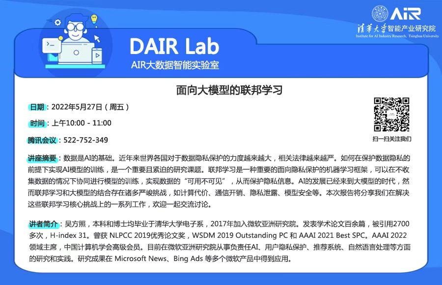 近年来世界各国对于数据隐私保护的力度越来越大,相关法律越来越严。如何在保护数据隐私的前提下实现AI模型的训练,是一个重要且紧迫的研究课题。联邦学习是一种重要的面向隐私保护的机器学习框架,本次报告将分享在解决联邦学习核心挑战上的一系列工作。